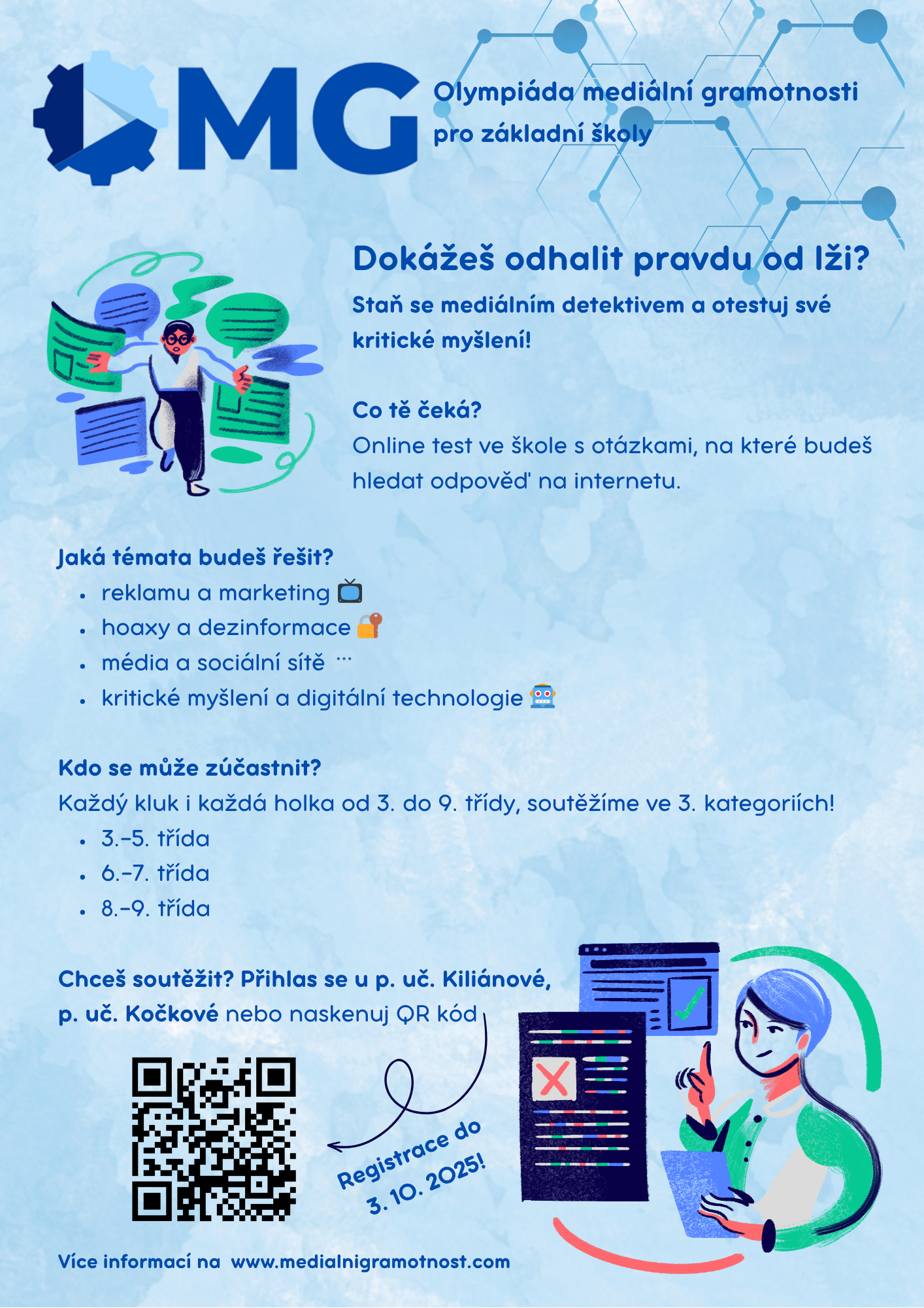 Školní kolo soutěže formou online testu zaměřeného na kritické myšlení, média, sociální sítě, dezinformace, hoaxy, reklamu a marketing. Soutěžit budeme ve třech kategoriích (viz leták). Registrace nutná do pátku 3. 10. 2025, abychom mohly zaregistrovat školu v termínu.